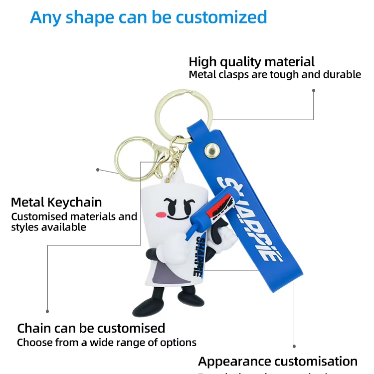 Ge ditt varumärke eller din idé liv med helt anpassade 2D- eller 3D-designer. Oavsett om det är en logotyp, maskot eller slogan, är våra mjuka PVC-nyckelringar skräddarsydda för att matcha din vision med livfulla färger och höga detaljer.