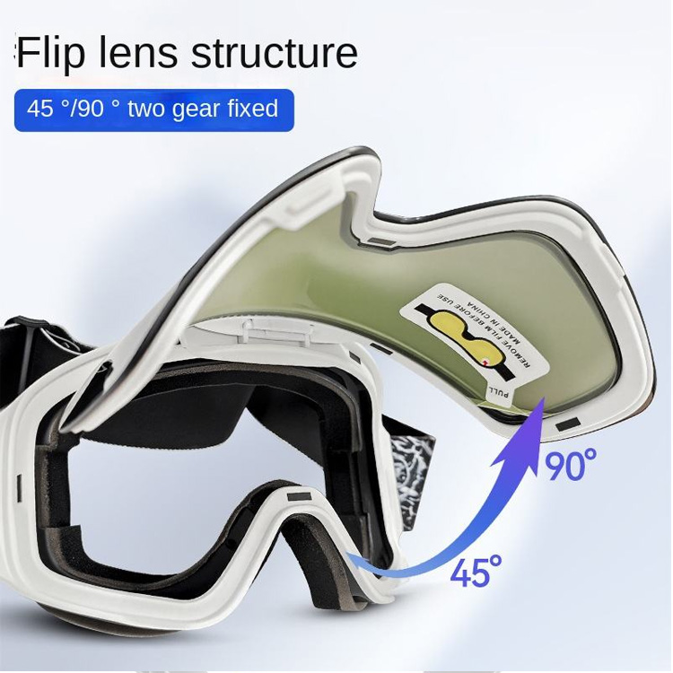Anpassade unisex dammtäta vindtäta UV400 snowboardglasögon. Din bästa grossistlösning för bergsporter i alla väder. Dessa unisex snowboardglasögon kombinerar avancerat damm- och vindtätt skydd med UV400-teknik. Med spegelpolariserade linser och ett revolutionerande magnetiskt flipsystem ger de oöverträffad visuell klarhet för skidåkning och snowboard.