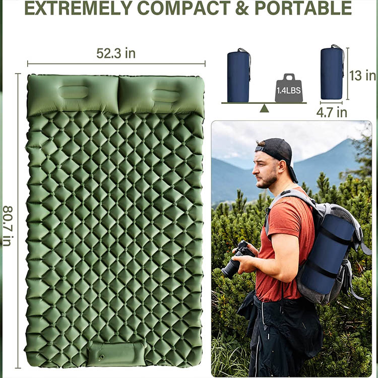 Dubbel-person camping liggunderlag Uppblåsbar campingdyna. Ultimat dubbel komfort för utomhusäventyr. Denna uppblåsbara campingdyna för två personer erbjuder rymligt sovutrymme med en innovativ fotbegränsande design för att förhindra glidning. Som en ultralätt lösning ger den oöverträffad bärbarhet och delad komfort för campingpar och vänner.