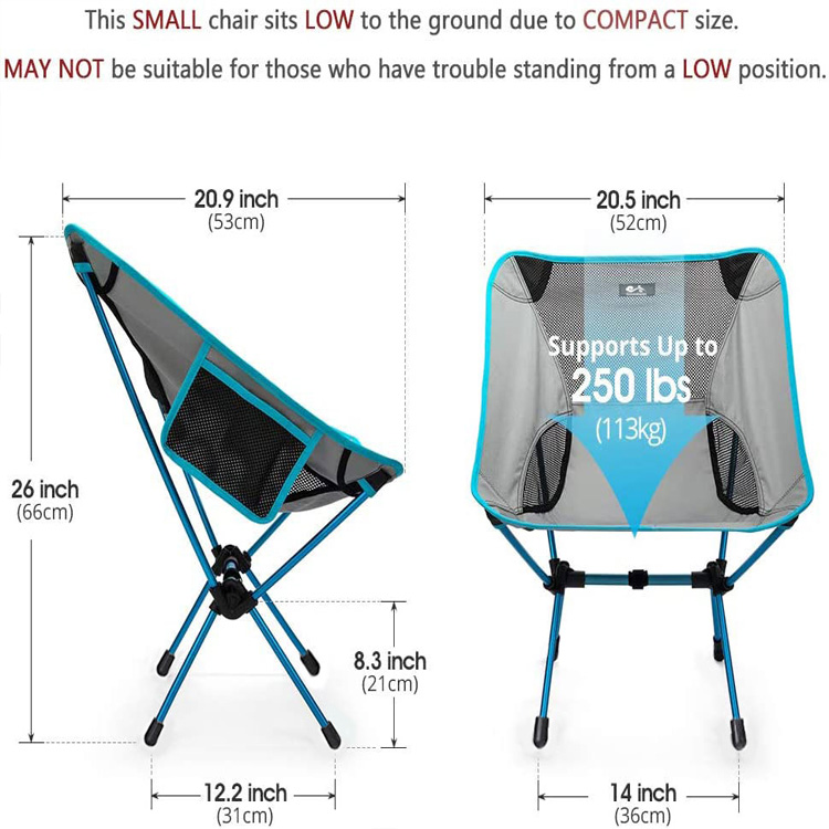 Ultralätt bärbar, kompakt hopfällbar campingstol. Njut av komfort var som helst med denna ultralätta bärbara hopfällbara stol. Kompakt och lätt att bära med sin praktiska förvaringsväska, It’s Perfekt för strandresor, camping, ryggsäcksvandring, vandring eller alla utomhusäventyr där komfort möter bekvämlighet.