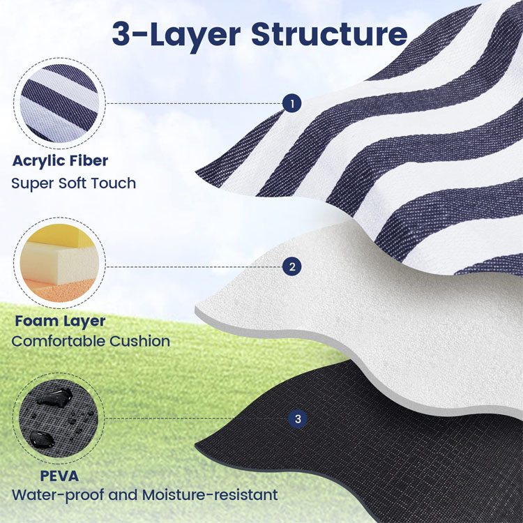 Tillverkad av högdensitetspolyester med avancerad TPU-beläggning, ger denna matta ett fullständigt skydd mot markfuktighet samtidigt som den motstår revor, fläckar och slitage från upprepad utomhusanvändning.