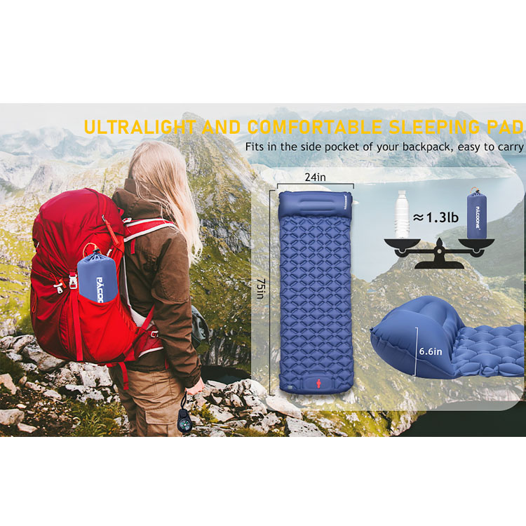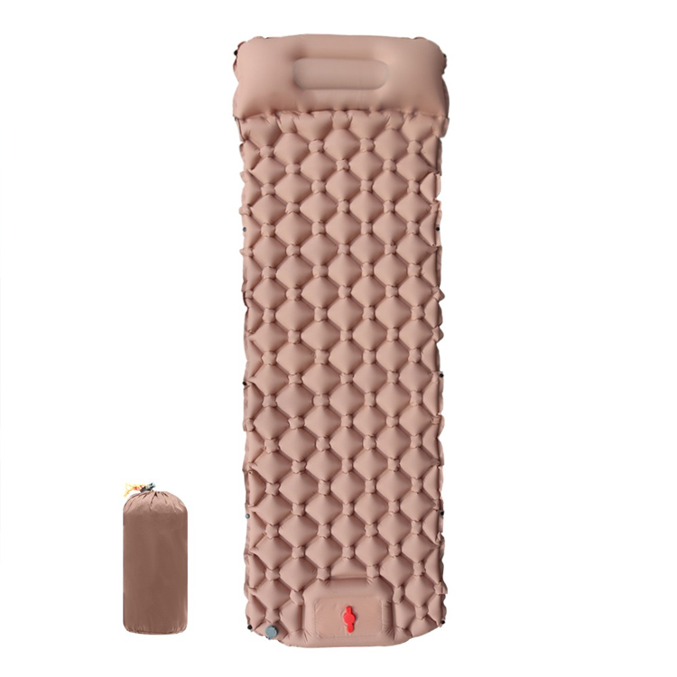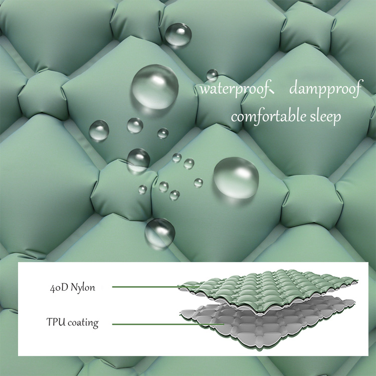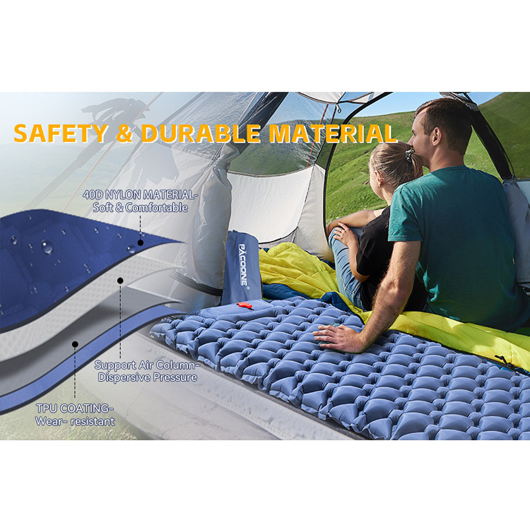 Lättvikts nylonmaterial Vikbart campingtält liggunderlag. Din ultimata bärbara sömnlösning för utomhusäventyr. Denna ultralätta uppblåsbara madrass har enkeltrycksuppblåsning och integrerad kudddesign. Tillverkad av slitstarkt nylonmaterial, ger den överlägsen komfort för vandring och camping, vilket säkerställer vilsamma nätter var som helst.