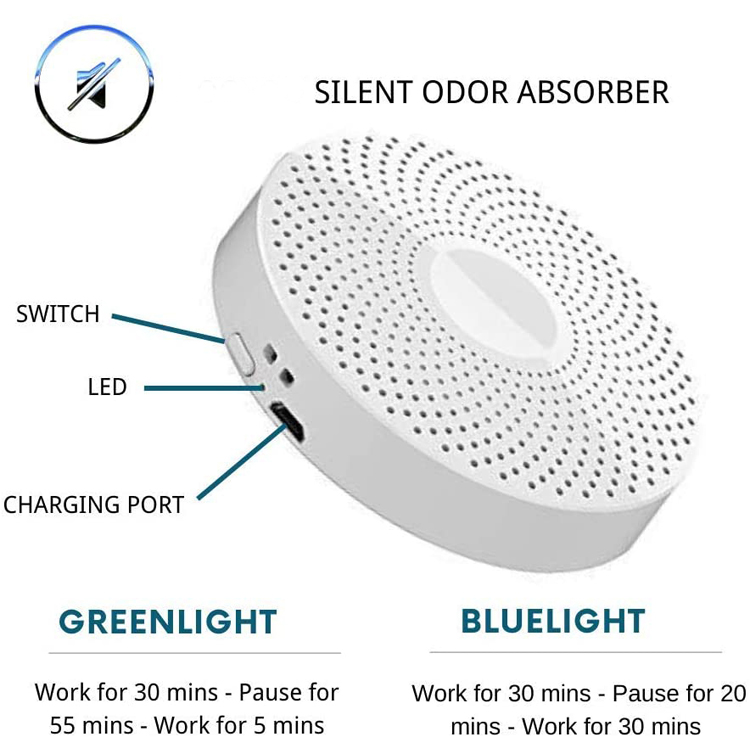 UPPELADE FÖRDELAR JÄMFÖRT MED TRADITIONELLA PRODUKTER( bakpulver, aromatisk kräm, deodorantboss, deodorant kol, malkulor, etc) £ºDenna mini USB luktabsorbenter kan ta bort irriterande kökslukter; Eliminera lukten av rök; Håll badrummet fräschare. Håll husdjurslukter borta. Det är en PERFEKT GÅVA för arbete, sömn, studier och annat personligt bruk