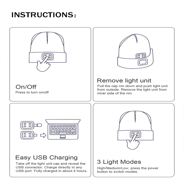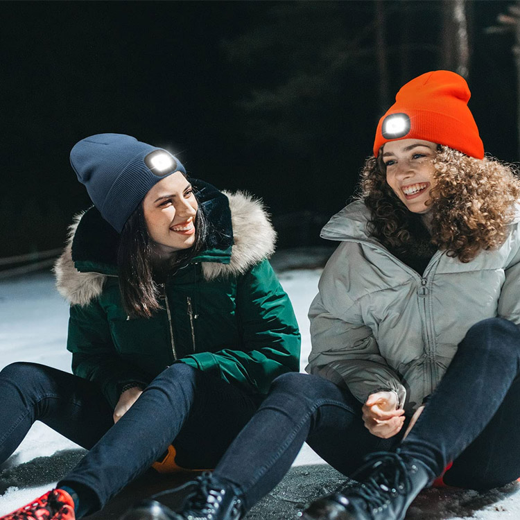 Uppladdningsbar handsfree LED-pannlampa Hatt stickad nattlampa. Lys upp dina nätter med vårt innovativa LED-lockljus. Denna uppladdningsbara pannlampsmössa har en bekväm stickad design för både män och kvinnor. Den erbjuder handsfree-belysning och är den perfekta följeslagaren för nattlopp, camping eller andra uppgifter som kräver starkt, fokuserat ljus.