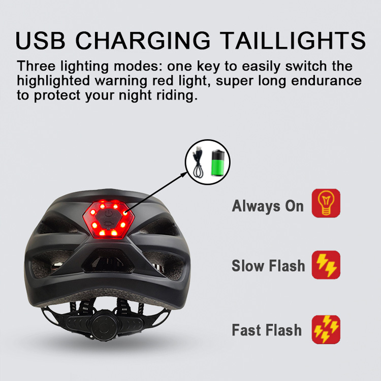 Har både främre vita och röda uppladdningsbara LED-lampor bak med flera lägen (stadigt, blinkande, stroboskop), vilket ger 360° synlighet för nattkörning. Det uppladdningsbara USB-batteriet ger upp till 6 timmars kontinuerlig drift.