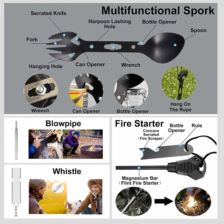 Detta allt-i-ett-kit är noggrant utarbetat för mångsidiga scenarier, och innehåller viktiga verktyg för vildmarkscamping, långa vandringsturer, fiskeutflykter och jaktexpeditioner för storvilt.